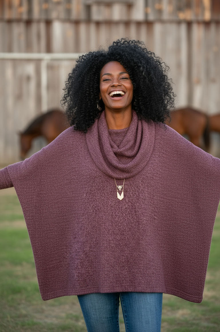 The sweater poncho you didn't know you needed! Featuring the classic, flowy poncho shape, our Mae updates the classic silhouette with optional sleeve, neck, hood, and belt details.